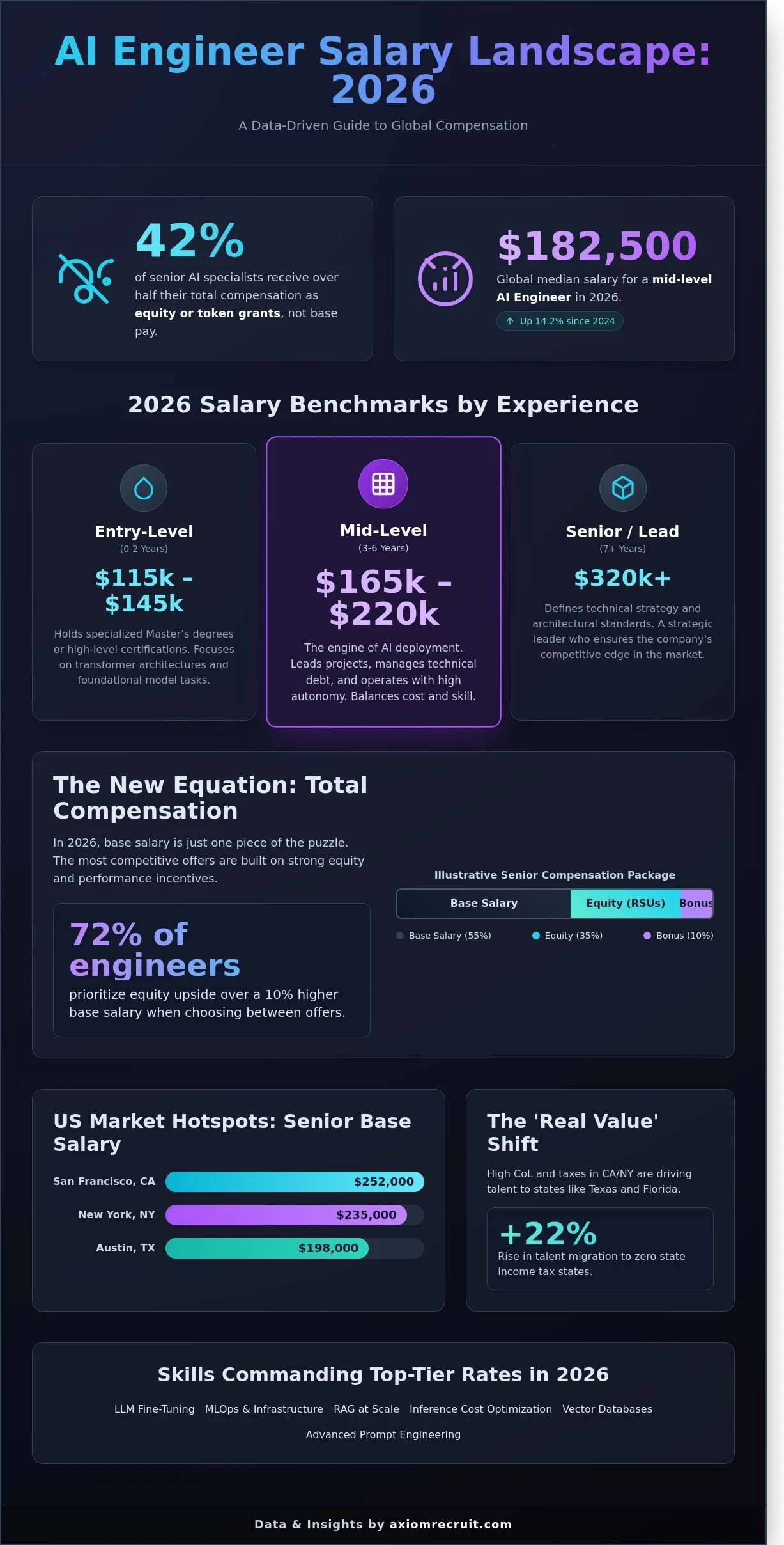 Recent 2025 market data reveals that 42% of senior AI specialists now receive more than half of their total compensation through equity or token grants rather than traditional base pay. You likely know that the ai engineer salary landscape moves faster than most global recruitment models can track. It's frustrating to compare offer letters when figures feel six months out of date or fail to explain the true value of a complex stock package. At Axiom, we believe transparency is the foundation of a successful career move.