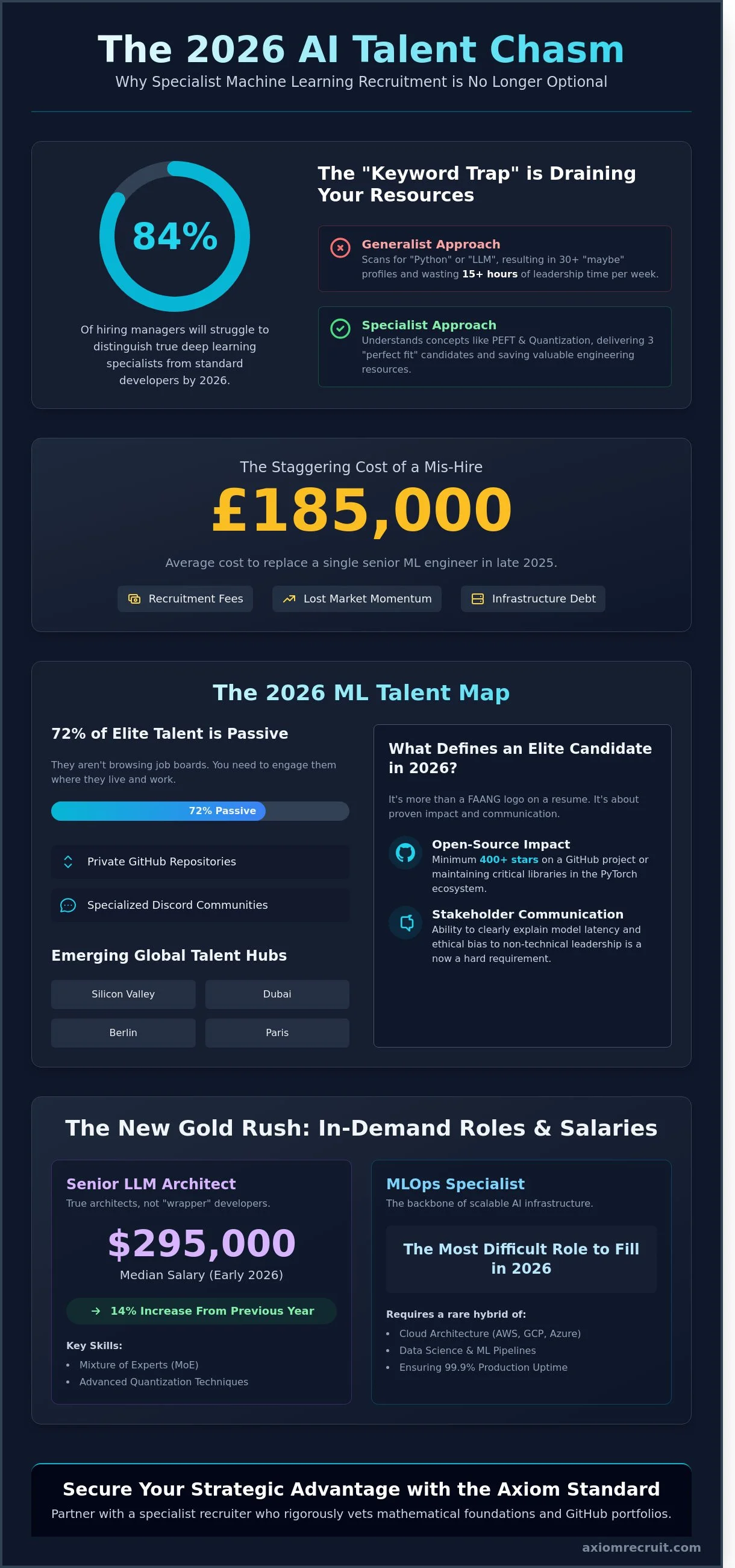 Winning the race for elite talent in 2026 requires more than a standard search. You need a partner who understands the technical nuances of GenAI and MLOps while providing accurate, data-driven salary benchmarking. Since 2021, Axiom Recruit has focused exclusively on the AI and Web3 sectors, bridging the gap between innovative companies and world-class engineers. We provide the bespoke market intelligence you need to navigate complex hiring landscapes across our established hubs in the UK, US, and UAE. Success depends on moving past simple keyword matching and implementing a rigorous technical vetting framework that validates true expertise. Partnering with a specialized machine learning recruiter ensures you don't just fill a seat; you secure a strategic leader capable of scaling your production infrastructure. Our global presence means we're on the ground where the talent lives, offering the local touch and deep industry knowledge required to close elite candidates in a competitive market. We've spent years refining our process to ensure your next hire is a perfect technical and cultural fit. We're ready to help you build the team that defines your company's next era of innovation.