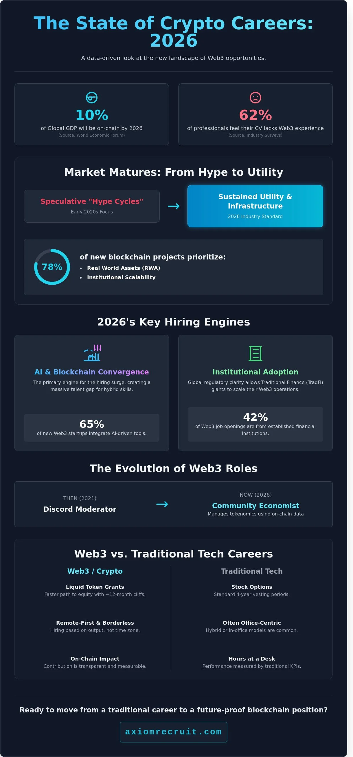 Stability is the new standard. Following the comprehensive implementation of global regulatory frameworks in late 2025, the sector achieved a level of professional maturity previously unseen. This environment allowed Traditional Finance (TradFi) giants to scale their operations. In 2026, 42% of Web3 job openings originate from established financial institutions like BlackRock, Fidelity, or JP Morgan. While understanding what is cryptocurrency remains the baseline for any candidate, these employers now look for experience in compliance, risk management, and legacy system integration.