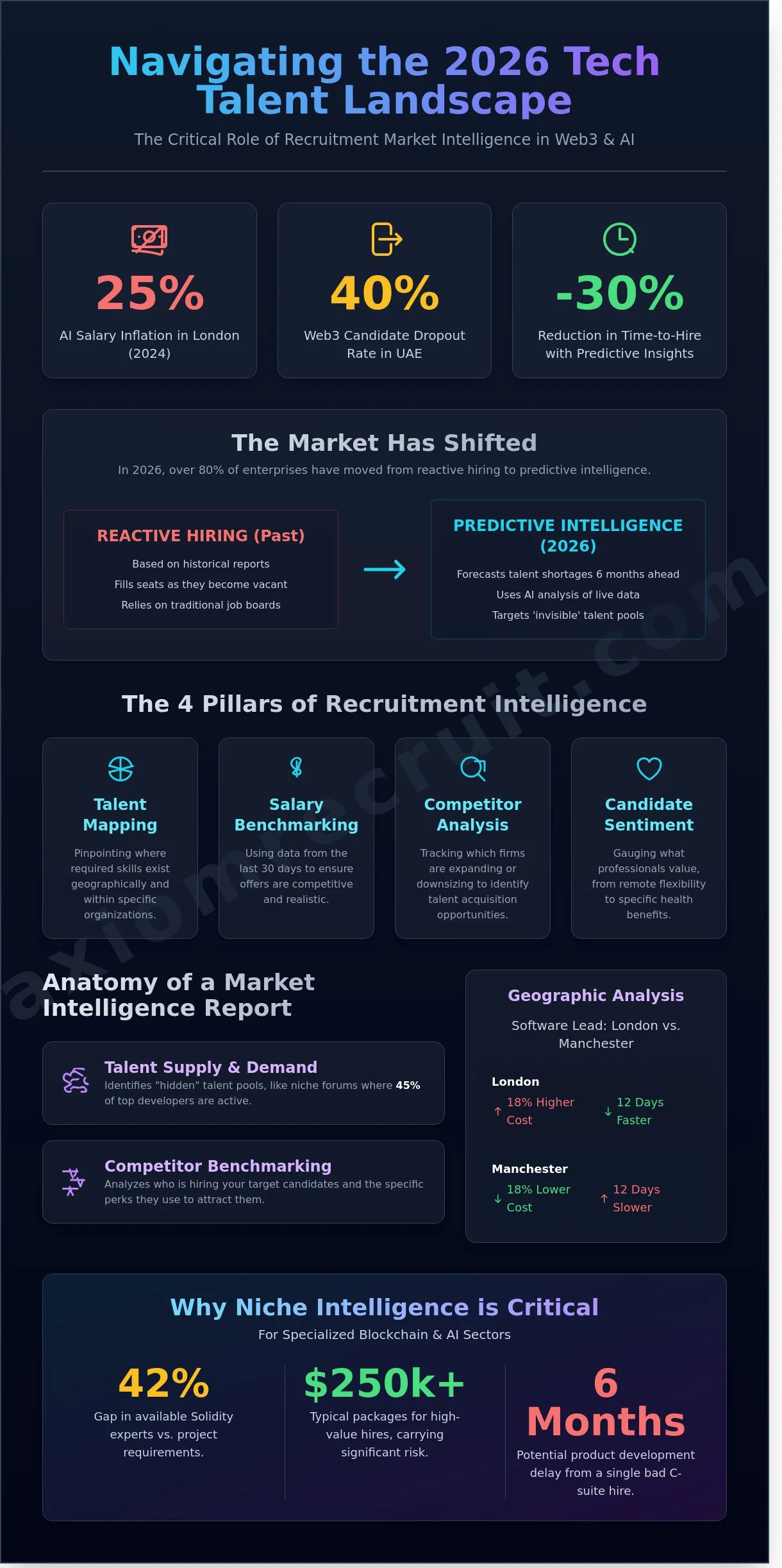 In 2024, AI salary inflation hit 25% in London, while 40% of Web3 candidates in the UAE dropped out of the hiring process before the final interview. These aren't just numbers; they represent millions in lost productivity and failed projects. To stay ahead, firms are moving beyond gut feelings and relying on recruitment market intelligence to navigate the volatile 2026 landscape. It's about having the right data to make confident decisions in a market that moves faster than most internal HR teams can track.