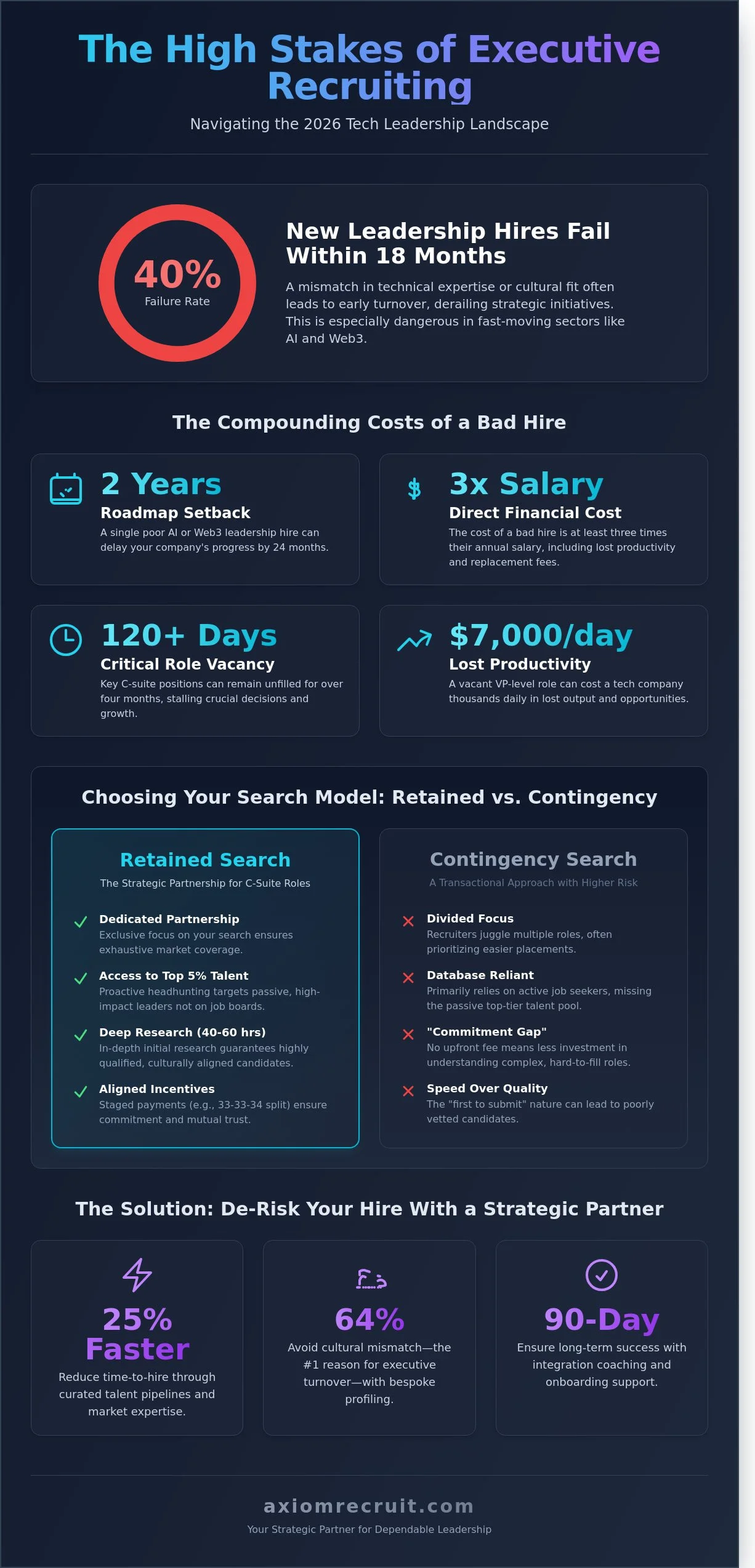 Axiom focuses on building these long-term bonds. We don't just send resumes; we act as an extension of your board. By 2026, the speed of market shifts means a single leadership error can set a company back 24 months. Our approach ensures you're matched with professionals who don't just fill a role but actively accelerate your roadmap.