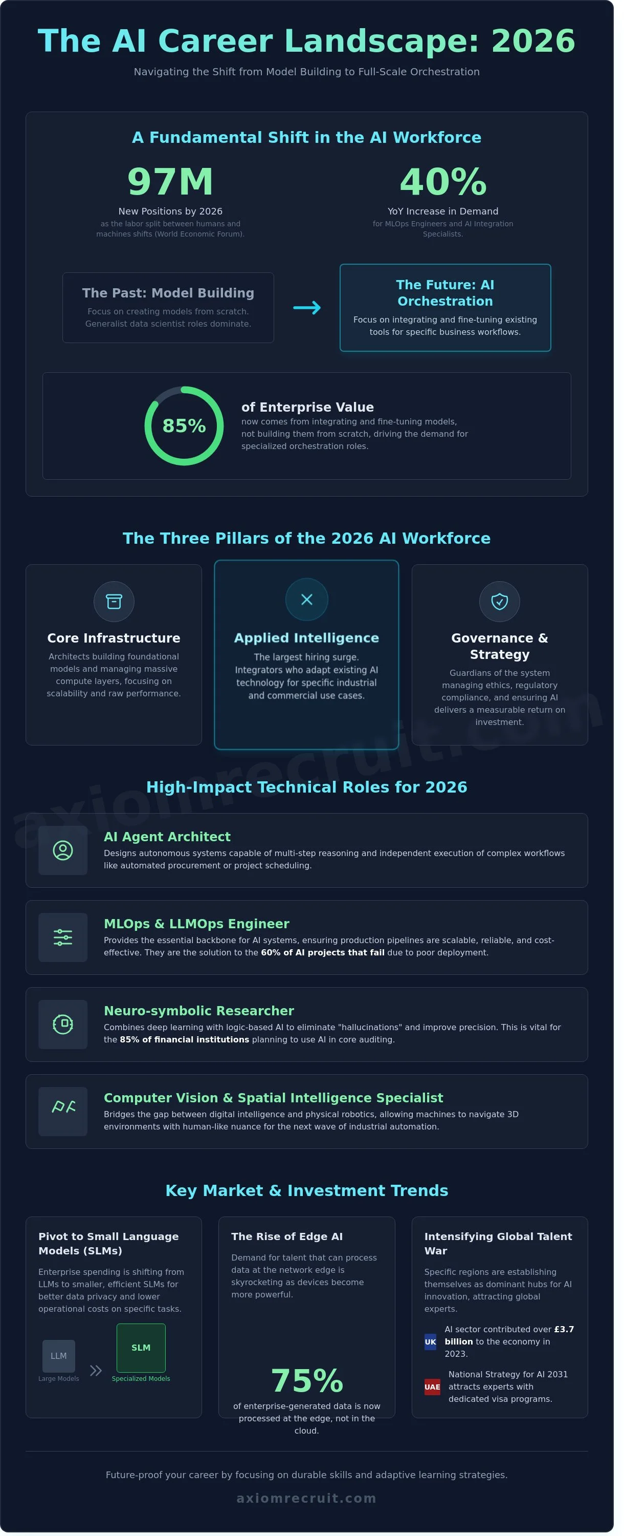 The hiring market currently prioritises "AI Orchestration" because 85% of enterprise value now comes from integrating and fine-tuning models rather than building them from scratch. We are seeing a sharp decline in the demand for generalist "Data Scientists," a role that dominated the 2010s. In its place, hyper-specialised functions have emerged. Our consultants at Axiom are seeing a 40% year on year increase in requests for MLOps engineers and AI integration specialists who can connect disparate systems into a cohesive unit.