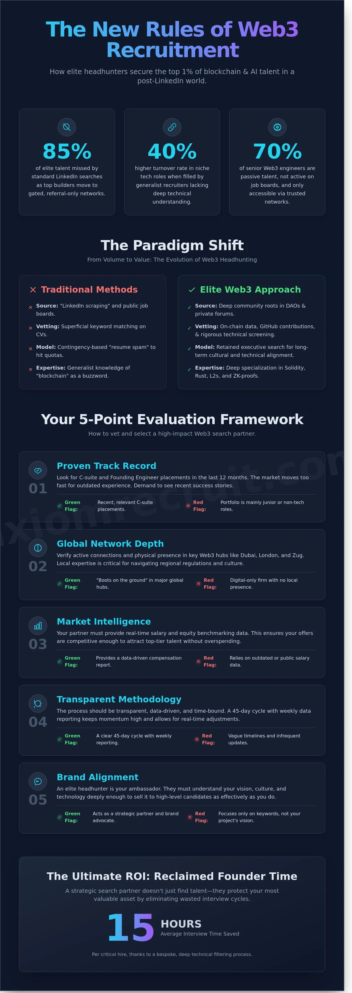 Many firms act as "database scrapers" who simply resell public LinkedIn data without adding value. You can spot these recruiters by their lack of specific candidate insights. If they can't explain a candidate's specific contributions to a previous DAO or protocol, they haven't vetted them. At Axiom, we focus on deep verification to protect your interests:
