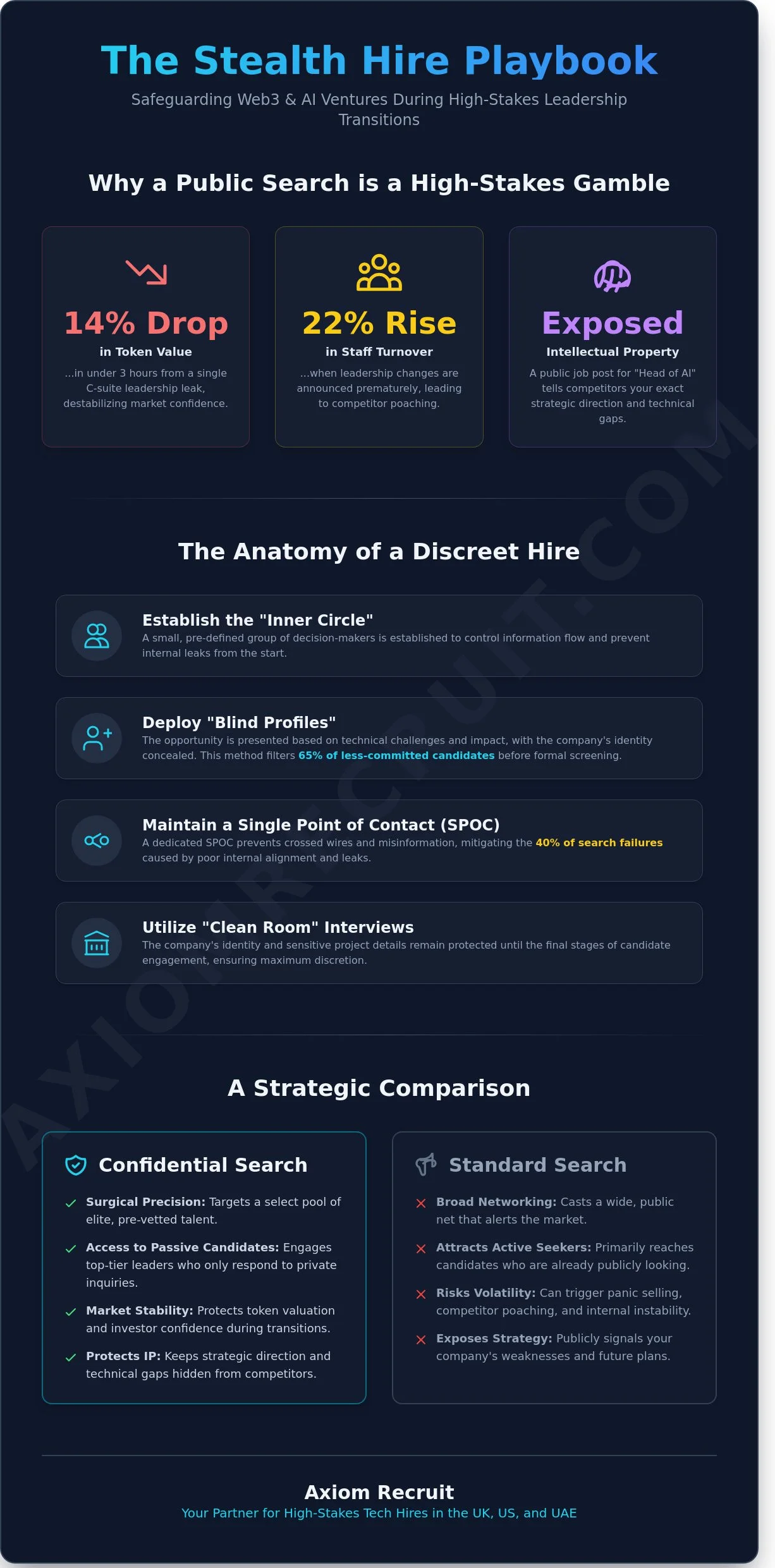 A confidential executive search is a restricted-access hiring process designed for roles that are critical to a company's survival. Unlike standard recruitment, this method keeps the vacancy hidden from the public, the broader workforce, and competitors. In the high-stakes sectors of Web3 and AI, stealth hiring has become a primary defensive strategy. By 2026, market volatility and the speed of technical shifts mean that a single leadership leak can trigger an immediate 12% drop in token valuation or destabilize investor confidence during a Series B funding round.